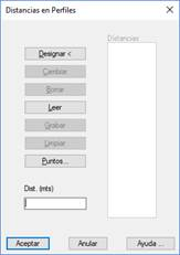 Distancia: Esta opción permite incluir los perfiles transversales correspondientes a determinados puntos kilométricos. La activación de esta opción habilita el botón Distancias. Con ello se accede a una nueva ventana titulada Distancias en Perfiles.