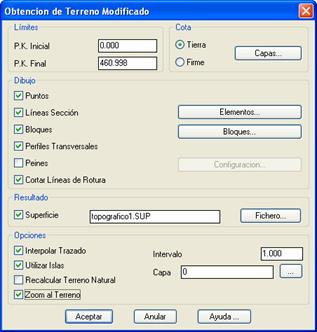 Este comando permite obtener el estado final de la superficie del proyecto, después de ejecutar el movimiento de tierras. Lo primero es seleccionar un fichero de segmento, o un fichero de eje y un fichero de perfiles transversales, generalmente generados con el comando Transversales > Generar Terreno Modificado. Seguidamente aparece el siguiente diálogo: