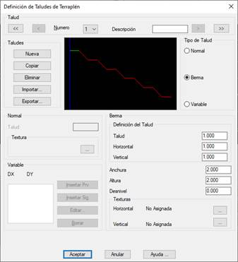 Nuevo: Crea un talud, por defecto de tipo Normal, asignándole el número siguiente al último existente en la lista. Para la definición de los diferentes tipos de talud se procederá de la siguiente forma.