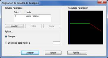 Aplicar: Con esta opción podremos controlar si la cuneta se inserta en función a la diferencia de cota con respecto al terreno natural en el punto de inserción del talud.