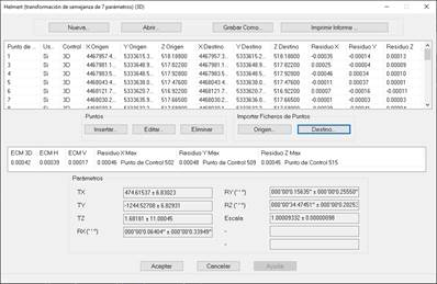 Residuo X, Residuo Y, Residuo Z: Diferencias en X, Y, Z entre los valores reales y los calculados. Se muestra sólo X e Y para transformaciones 2D.