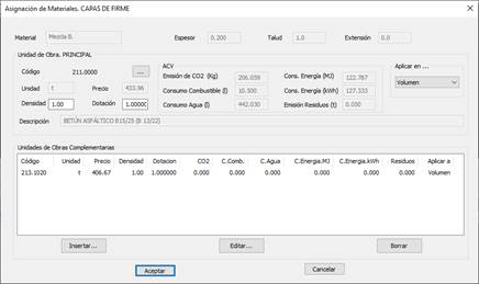 Existe la posibilidad de asignar varias unidades de obras complementarias al material de una capa determinada. Con los botones de “Insertar”, “Editar” y “Borrar” podremos gestionar las asignaciones.