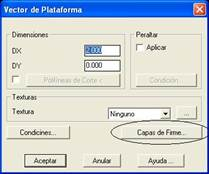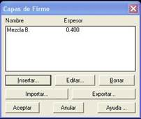 Para realizar esta definición, al editar las propiedades del vector, nos aparecerá una ventana en la cual si presionamos el botón “Capas de Firmes” podremos especificar las características de cada una de las capas de firme para el vector en cuestión.