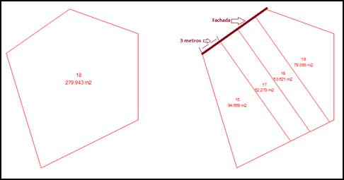 In the following screenshot you can see the subdivision of a plot, the shared side with the facade is 3 meters.