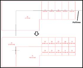 In the following image you can see how a set of plots are divided automatically from the intersecting polyline.