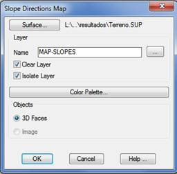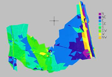 This command draws a map based on the current surface, assigning a different color to each triangle according to the orientation of its slope with regard to the cardinal points. The options available the same as the ones available in the Maps/Render > Draw Height Map command. The default interval and color configurations can be edited using the Map Configuration, Slope Dir. button.