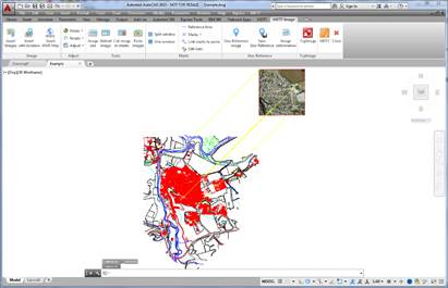 This command will request the selection of an image which will be georeferenced and it will show the following dialogue in which the name of the file of the selected image is revealed which may be changed, designating on the screen the list of all the Reference lines and Links to be found in the drawing which may be activated or deactivated to form part of the transformation calculations and said transformation may be Helmert 2D based on two pairs of points, or Affine, based on three pairs of points. As a result, the MSE, mean square error, will be shown as well as the Max.Res., the maximum residue, X0 and Y0, coordinates of the upper left-hand point of the image, Scale on X and Y, in m/pixel and Rotation in X and Y.