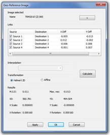 The Apply button allows the viewing of the result of the Georeferencing before endorsing the operation. By pressing OK the Georeferencing is endorsed and the image is inserted in the coordinates resulting from the transformation, the destination directory will be requested for the georeference file which has been created and the Reference lines, Links and Marks will be deleted which have been involved in the transformation. By pressing the Cancel button, the operation cancelled and all the elements are restored.