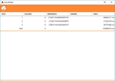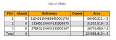 This shows information about the name, owner, reference and area of all plots of the drawing. The number of islands associated with each of the plots is also shown.