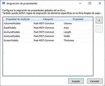 Click on the Property Assignment button and add the correspondence between the measurement properties of the objects with the properties of the DTM entities. These can be from the group of common properties (Pset-MDT-Common) or those specific to the object (Pset-MDT-RoadbedLayer, for example).