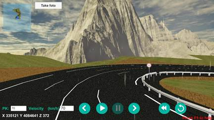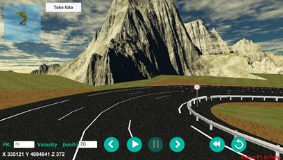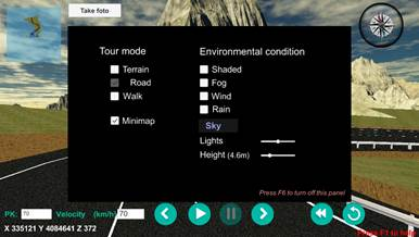 In this mode you can do an automatic tour (previously defined from the DTM Road Route command), where you can see at all times coordinates X, Y, Z and the Station, we can change it and go directly to that station, where the initial speed that will be that entered using the MDT command. However the speed can be changed at any time during the tour by pressing the Q key to increase it and the Z key to reduce it, and a button bar is available to control the route:
