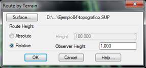 To generate the route by terrain, the program employs a predefined texture configuration. A more realistic result can be obtained by inserting a georeference image with the Insert Image command this options is only with surface file.