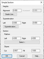 Heights: We select the height of the horizontal alignment of our road or take the height from the grade line selected. Moreover, on selecting the grade line file we can implement a positive or negative increase in the height of the station to be designed.