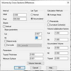 Once the values of the simulation of our road and its section have been entered, the program will ask for the type of list to be executed, in addition to a series of parameters required for the purposes of calculation. These parameters are listed in the section Volume by Cross-Section Difference section.