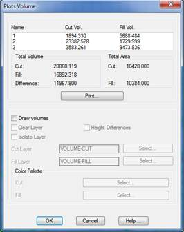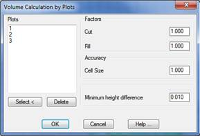Plots: Name of the plots detected in the drawing the volume of which is to be calculated. Plots may be Selected or Deleted with the aim of customizing the list.