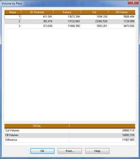 The Print button creates a list featuring the names of the plots and the information on the cubic measurement of each one: