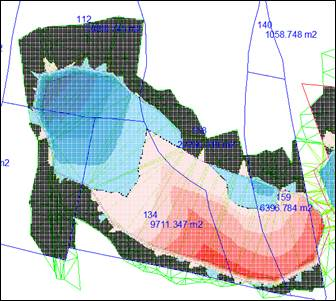 Activating the Draw Volumes box will provide a graphic representation of the results, consisting of a mesh located only in the area in which both mesh files are defined. Each cell will have a color indicating if the area is in cut, fill, or does not possess a volume within the limits defined in the settings. A range of colors may be assigned to both the cut and the fill; for this we have the option of selecting the corresponding color palette.