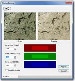 Canal Azul: para indicar el valor gamma para el canal de azul, puede oscilar entre 10 y 500, el valor 150 equivale el nivel gamma original de la imagen.