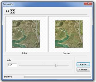 Permite cambiar la saturación de la imagen seleccionada. Entendemos como saturación a la pureza relativa o cantidad de luz blanca mezclada con un tono (representa el color dominante), es por eso que los colores puros del espectro están totalmente saturados, no tienen ninguna cantidad de luz blanca.