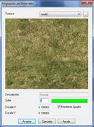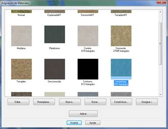 Con este comando se puede asignar manualmente un material a determinados triángulos de la superficie actual, con objeto de mejorar su presentación en los comandos de Recorrido por Terreno, y Recorrido por Carretera, al cerrar la ventana, se ejecuta el Visor.