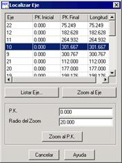 Seleccionando un eje de la lista, se habilitan los botones para localizar el eje. Zoom al Eje redimensiona la ventana del CAD para que la polilínea que representa el eje seleccionado sea visible en su totalidad, y la selecciona automáticamente. Zoom al P.K. redimensiona la ventana, centrándose en el P.K. especificado. El Radio del Zoom determina la zona de dibujo visible alrededor el punto. El botón Listar Eje permite obtener un listado del eje seleccionado.