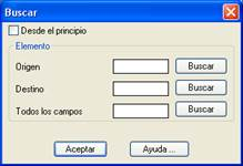 El programa buscará a partir del elemento actual, a no ser que se active la casilla Desde el principio. Según la casilla que se rellene, puede buscarse por nombre de la estación Origen, por la estación o punto Destino, e incluso por el valor de un campo rellenando el dato Todos los campos.