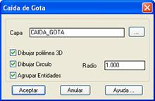 A continuación el programa solicita un punto inicial para el recorrido, y dibuja la polilínea que representa el recorrido de la gota. Activando la opción Dibujar Circulo se puede distinguir mas fácilmente el punto inicial del recorrido, porque el programa dibuja un circulo en esa posición. Con la opción de Agrupar Entidades, se agrupan la polilínea y el circulo dibujados, de forma que se seleccionan ambos automáticamente al seleccionar una de las entidades. Así se pueden eliminar ambas fácilmente.