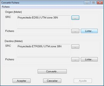 A continuación, en la parte inferior de cada apartado, se debe seleccionar el fichero origen, que contiene las coordenadas a convertir y puede tener cualquier extensión, y el fichero destino, que se creará con las nuevas coordenadas y extensión TXT o PUN. Se debe tener en cuenta que se borrará toda la información existente en este último.