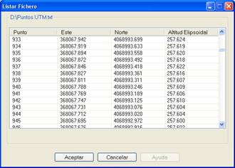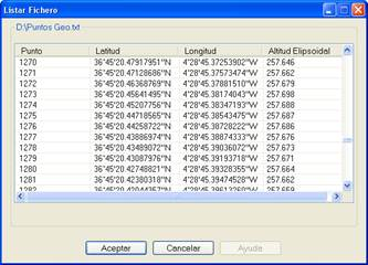Una vez realizada la conversión, se puede visualizar el fichero pulsando el botón Listar…, opción que también está disponible para los datos origen, excepto para los ficheros GPX y KML.