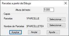 Nombre de Parcelas. Pulsando el botón Seleccionar se puede elegir o designar la capa en la que están dibujados como textos los nombres de cada parcela y situados dentro de su contorno. Si no se especifica esta capa, se asignará un nombre correlativo según el orden del dibujo.