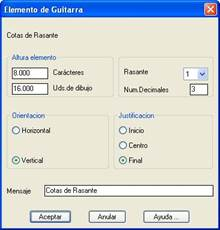 Este elemento de guitarra sólo se dibujará en el caso de que en el segmento exista una rasante definida. Representa las cotas de rasante de la rasante que contiene el segmento seleccionado. Seguidamente se muestra el diálogo y se detallan las características del mismo.