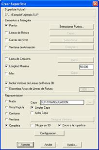 La creación de superficies es equivalente a la generación del modelo digital del terreno. Por ello mediante el presente comando se ejecuta el proceso de triangulación para la obtención de la red de triángulos irregulares. Cada una de las modificaciones realizadas sobre el modelo digital original puede ser grabado como una superficie diferente.