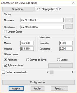 El botón Configuración permite modificar las opciones por defecto empleadas por la aplicación, tales como nombres de capas y parámetros para suavizado de curvas de nivel. En el caso de que se emplee una malla como superficie actual, en este diálogo se pueden modificar los parámetros para controlar su generación.