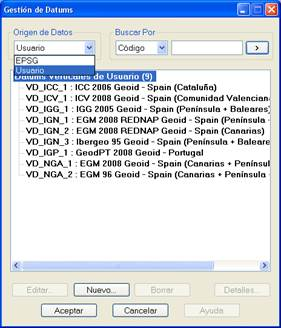 La lista desplegable del apartado Origen de Datos permite cambiar la consulta de datos EPSG a datos de usuario y viceversa.