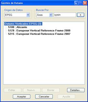 Muestra el listado de datums verticales incluidos en la base de datos EPSG. También permite editar, borrar y crear nuevos datums verticales de usuario.