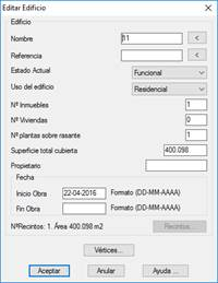 Una vez seleccionada la polilínea nos aparecerá un diálogo donde especificaremos las características del nuevo edificio a crear. La mayoría de los atributos que se describen y los posibles valores asignados están pensados para la importación o exportación de ficheros para el Catastro.