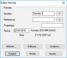 Si seleccionamos una única polilínea, seguidamente nos aparecerá un diálogo donde especificaremos las características de la parcela a convertir. Las características de esta ventana se explican con más detalle en la descripción del comando “Editar Parcela”.