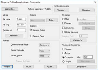 Presentación en pantalla de un segmento (ver comando Ejes > Segmentos), es decir, la posibilidad de dibujar un perfil completo con toda la información de rasantes, peraltes, longitudinales, curvatura, etc. Si se pretende dibujar solamente el terreno, usar el comando Longitudinales > Dibujar Perfil Compuesto.