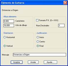 Este elemento de guitarra representa las distancias al Pk inicial del longitudinal que se va a representar. Seguidamente se muestra el diálogo y se detallan las características del mismo.