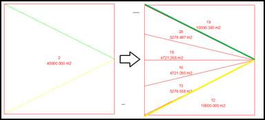 En la siguiente imagen se puede apreciar la subdivisión de una parcela en cuatro parcelas, partiendo desde el ángulo que representa la línea amarilla hasta el ángulo que representa la línea verde.