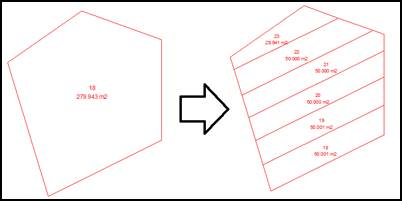 Esta herramienta nos permite dividir la parcela por paralelas al lado indicado. La división se puede realizar por superficie de las parcelas a crear, número de parcelas o distancia al lado seleccionado. Los pasos a seguir son los siguientes: