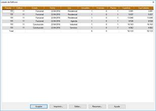 Nos mostrará los edificios asociados a la parcela. Más adelante se explica con detalle el concepto de edificio y la utilidad de los mismos. Para que un edificio esté asociado a una parcela, éste debe de estar completamente dentro del contorno de la misma.