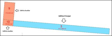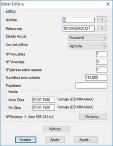También se mostrará el número de recintos asociados al edificio. Por defecto siempre existirá un recinto que será el propio edificio, y se podrán designar recintos adicionales. Estos recintos designados posteriormente se clasificarán como edificios auxiliares. El área que se muestra sería el área del edificio editado más la suma de todos los edificios auxiliares que tenga asociados.