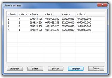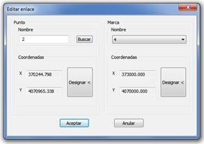 Al seleccionar un elemento de la lista y pulsar Insertar o Editar, se muestra el siguiente diálogo donde se podrá Buscar un determinado Punto MDT, entre todos los que haya en el dibujo, o designar en pantalla el punto, y además se podrá elegir una Marca de la correspondiente lista desplegable o igualmente designarla en pantalla.