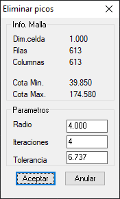 Tolerancia: Define la diferencia de cota mínima para considerar un vértice como pico, al comparar su cota con las cotas de su entorno (delimitado por el radio). Por defecto, el programa propone que todas las cotas que esten por encima del 10% de la distancia entre la cota mínima y la media de la malla se consideren picos.
