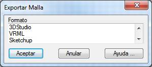 Este comando por el contrario nos va a permitir exportar mallas de MDT a otros formatos externos a MDT. Aparecerá un dialogo con la lista de formatos soportados, y tras seleccionar uno de ellos, el programa pregunta por dos ficheros: primero el fichero de mallas de MDT y finalmente el fichero de malla a crear del formato seleccionado.