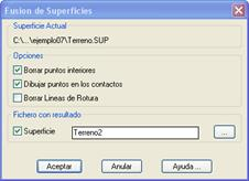El proceso de fusión permite incluir dentro de la superficie actual, otra superficie. Equivale a realizar un Vaciado por Áreascon el contorno de la superficie que se incluye, y luego copiar sus triángulos en la superficie actual. Para que el resultado sea correcto, es necesario que las cotas en el perímetro de la superficie a incluir coincidan, o sean muy próximas, a las cotas de las coordenadas correspondientes en la superficie actual, ya que de lo contrario se producirían incongruencias en el modelo digital.