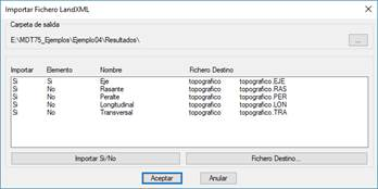 El programa inicialmente nos solicita el fichero LandXML que deseamos convertir, y seguidamente aparecerá la siguiente ventana donde se muestra la información asociada a dicho fichero, permitiendo la selección de sus diferentes elementos.