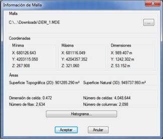 Coordenadas: Coordenadas mínimas y máximas de la malla así como la dimensión de la misma en metros.