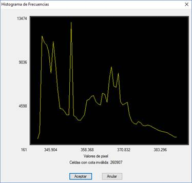 Si pulsamos el botón Histograma nos muestra la distribución de los valores de la malla. En el eje X del gráfico se indican los valores de las cotas, y en el eje Y la frecuencia absoluta (número de píxels con ese valor de cota). De esta forma se muestra intuitivamente la distribución de cotas en la malla. Asimismo se muestra el número de celdas sin valor de cota definido.